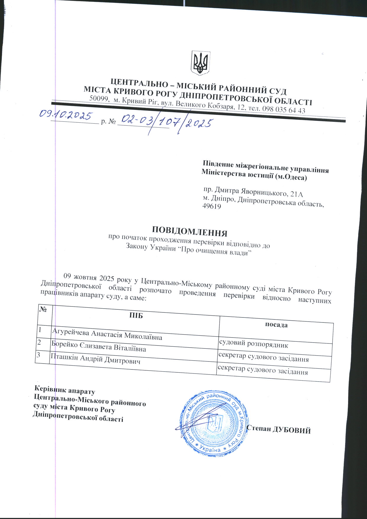 Повідомлення про початок проходження перевірки працівників апарату суду