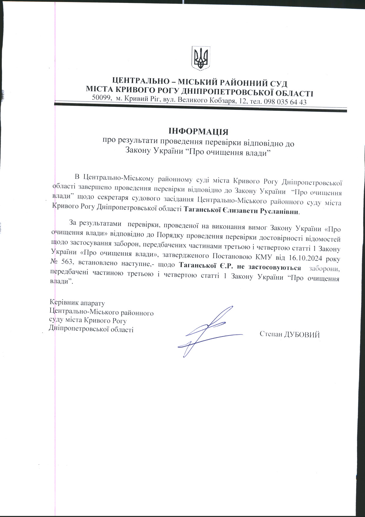 Повідомлення про результат проходження перевірки працівників апарату суду